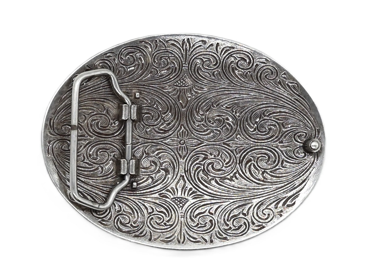 Ariat oval mens buckle by M&F Western Products. It has a raised blue and red painted American flag and eagle with an engraved scrolling background in matte black paint. Antique gold raised engraved scrolling accent. Smooth edge.