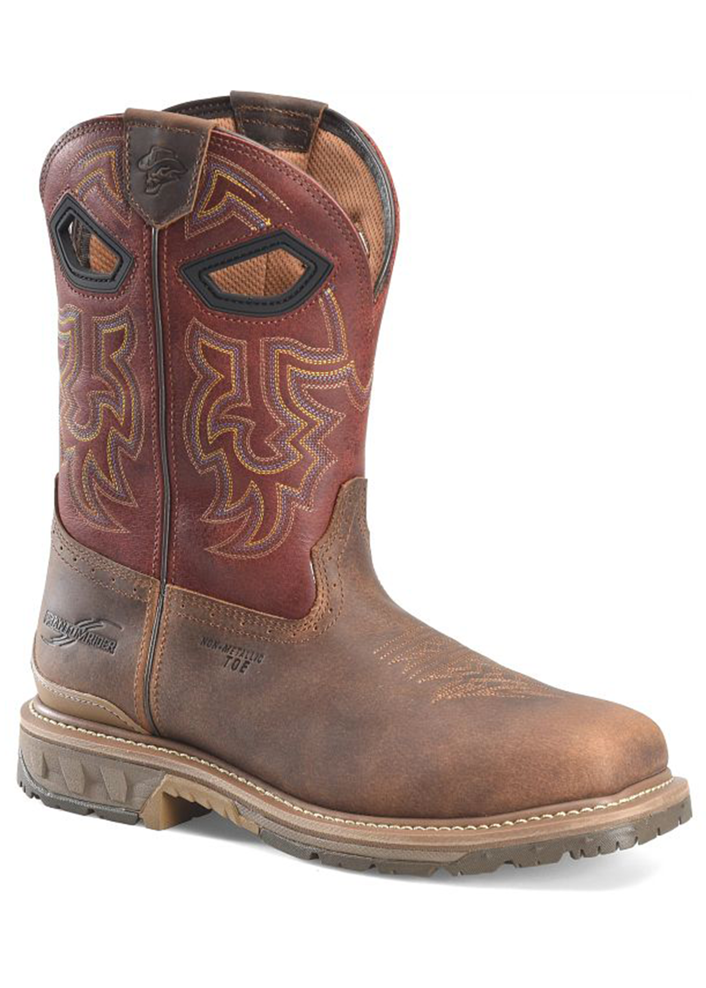 Built tough with barnyard acid-resistant leather and a composite safety toe, our Phantom Rider Brock roper is designed for durability and comfort. With a stylish red leather quarter, these boots feature our signature oil and slip-resistant I.C.E.™ outsole and AG8 dual-density footbed for demanding work environments.