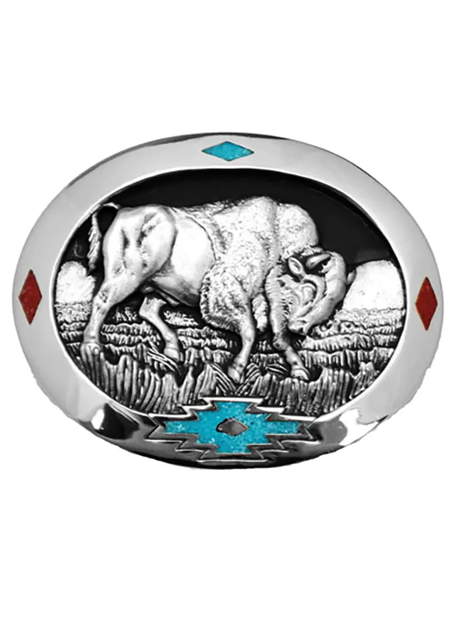 The S-4984 Bison Belt Buckle is a captivating accessory that combines rugged style with a touch of Americana. Crafted from 12-gauge steel, this buckle features a rounded leather slot and measures 3-1/4" wide x 3" tall. The design is a rectangle with star detailing in each corner, reminiscent of classic Western motifs. Here are the details: