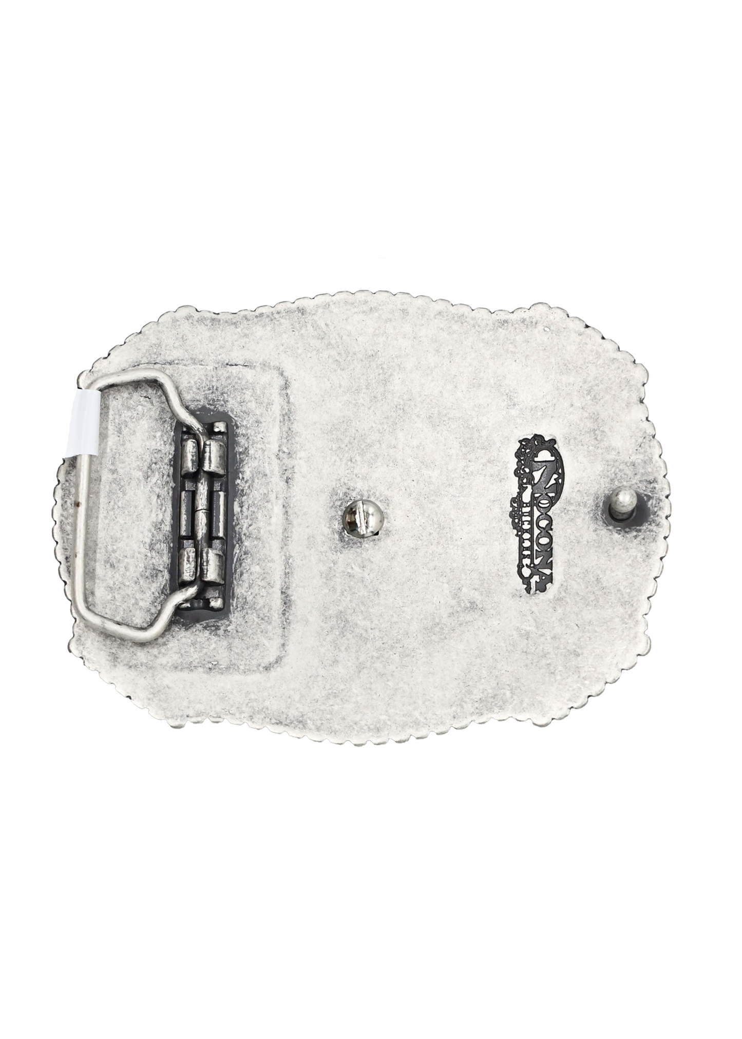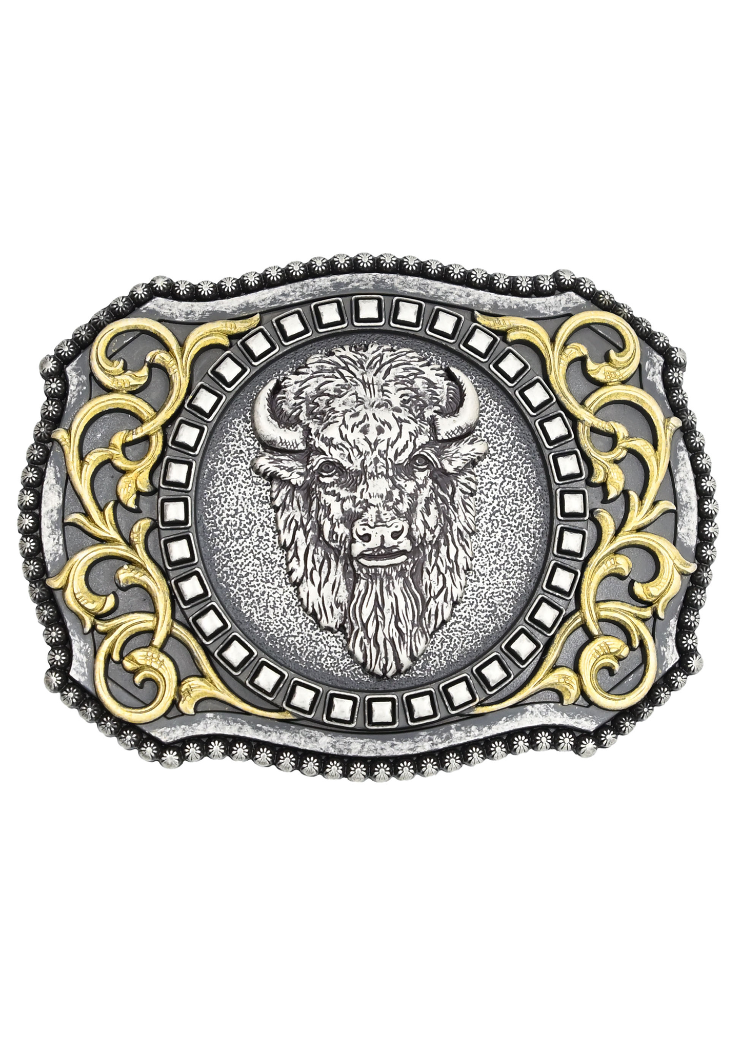 Nocona men's western buckle by M&F Western Products features a detailed buffalo head in the center of a rectangular buckle. The buffalo head is framed by silver squares and then decorated by antique gold scroll design. Measures: 3 X 4.