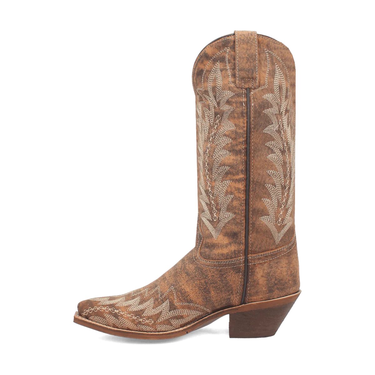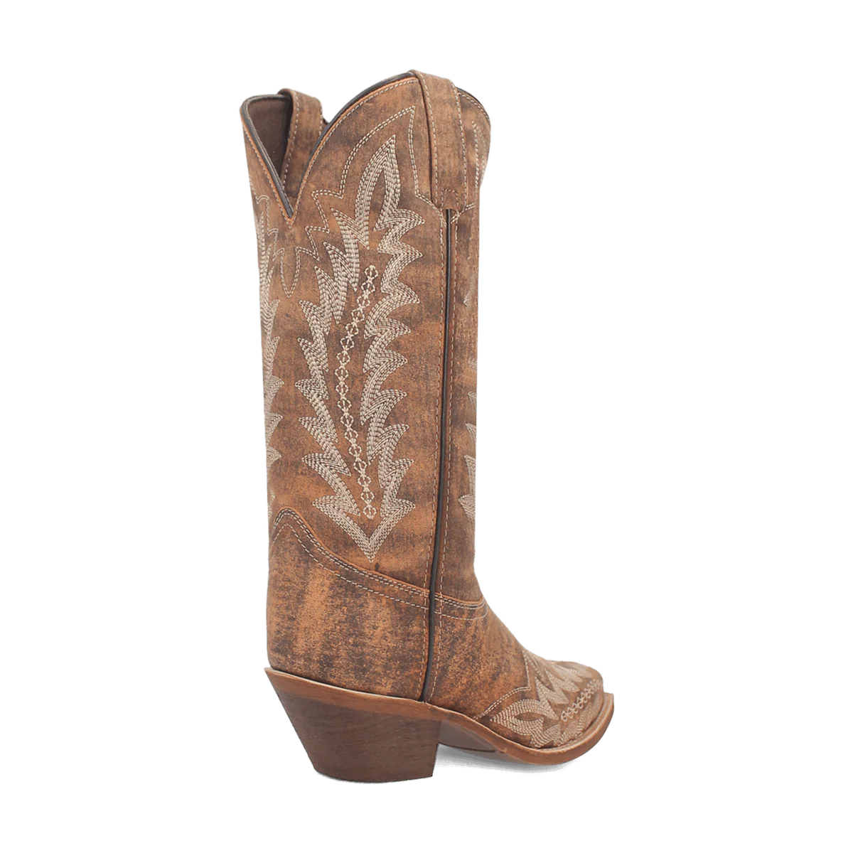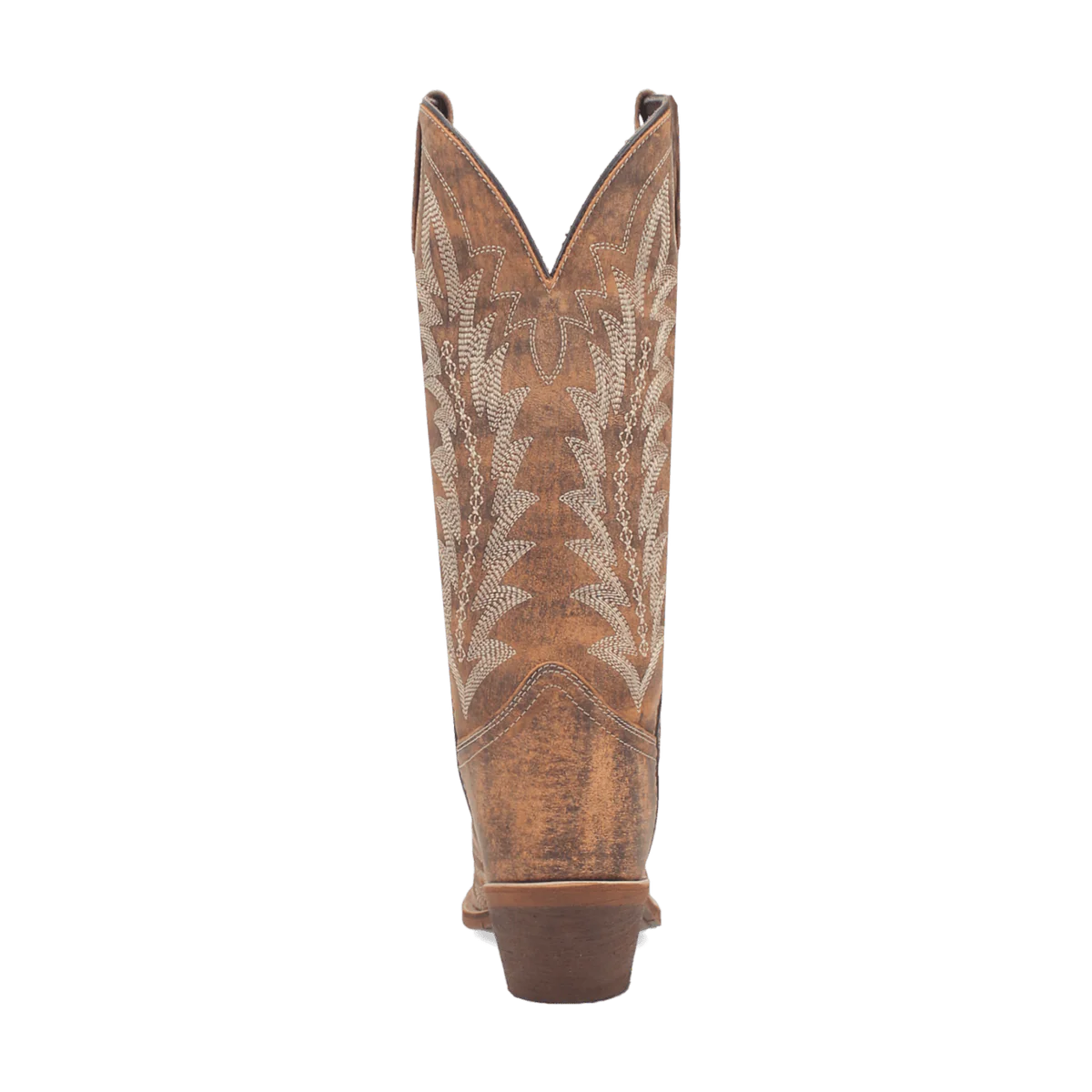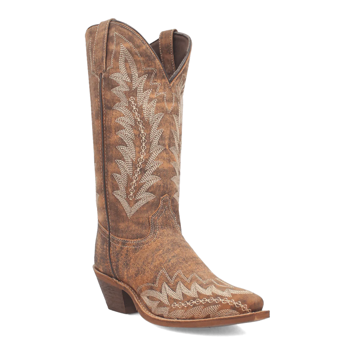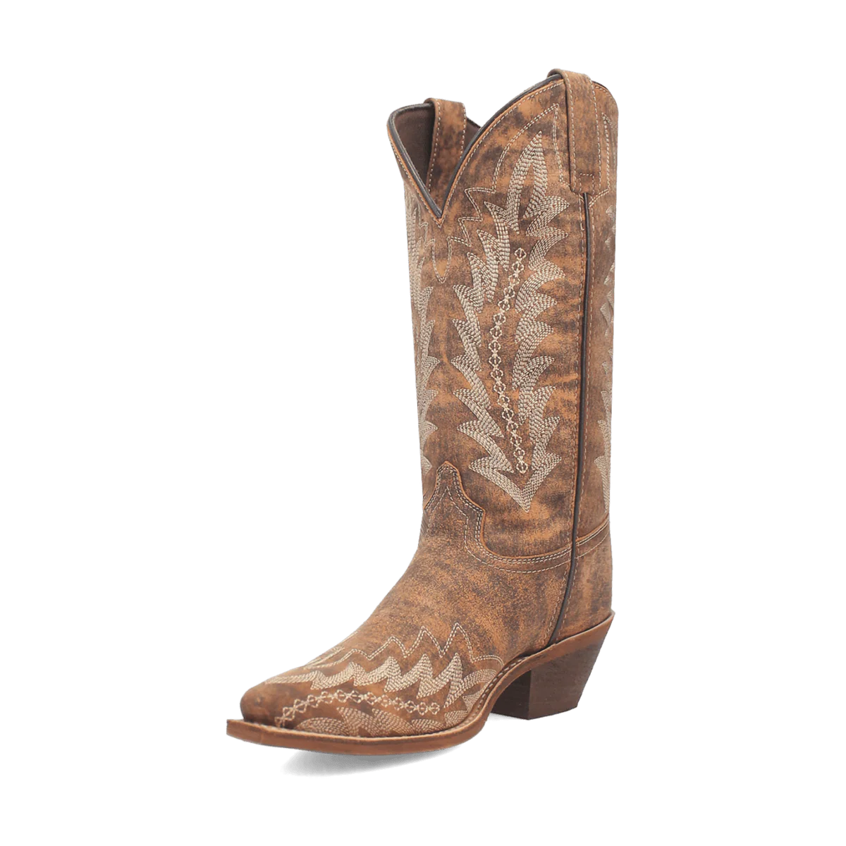 The Emmylee boot in tan effortlessly merges Western sophistication with rugged charm. Crafted with intricate Western stitching embellishing the top and foot, it showcases a snip toe, medium cowboy heel, and a cushioned comfort insole for added style and comfort.