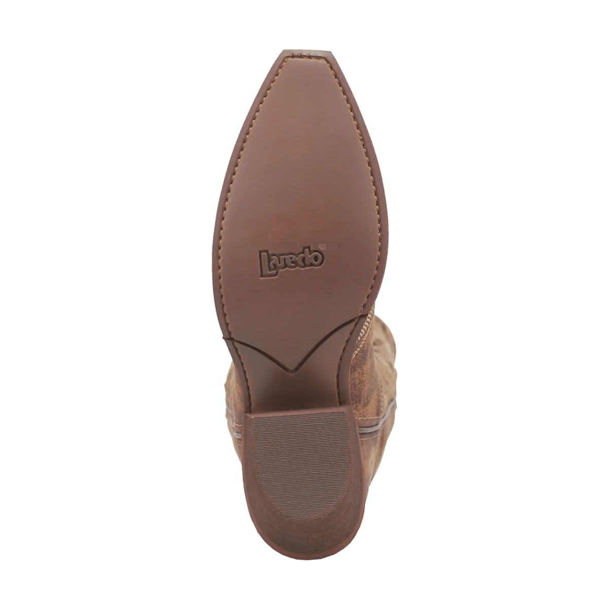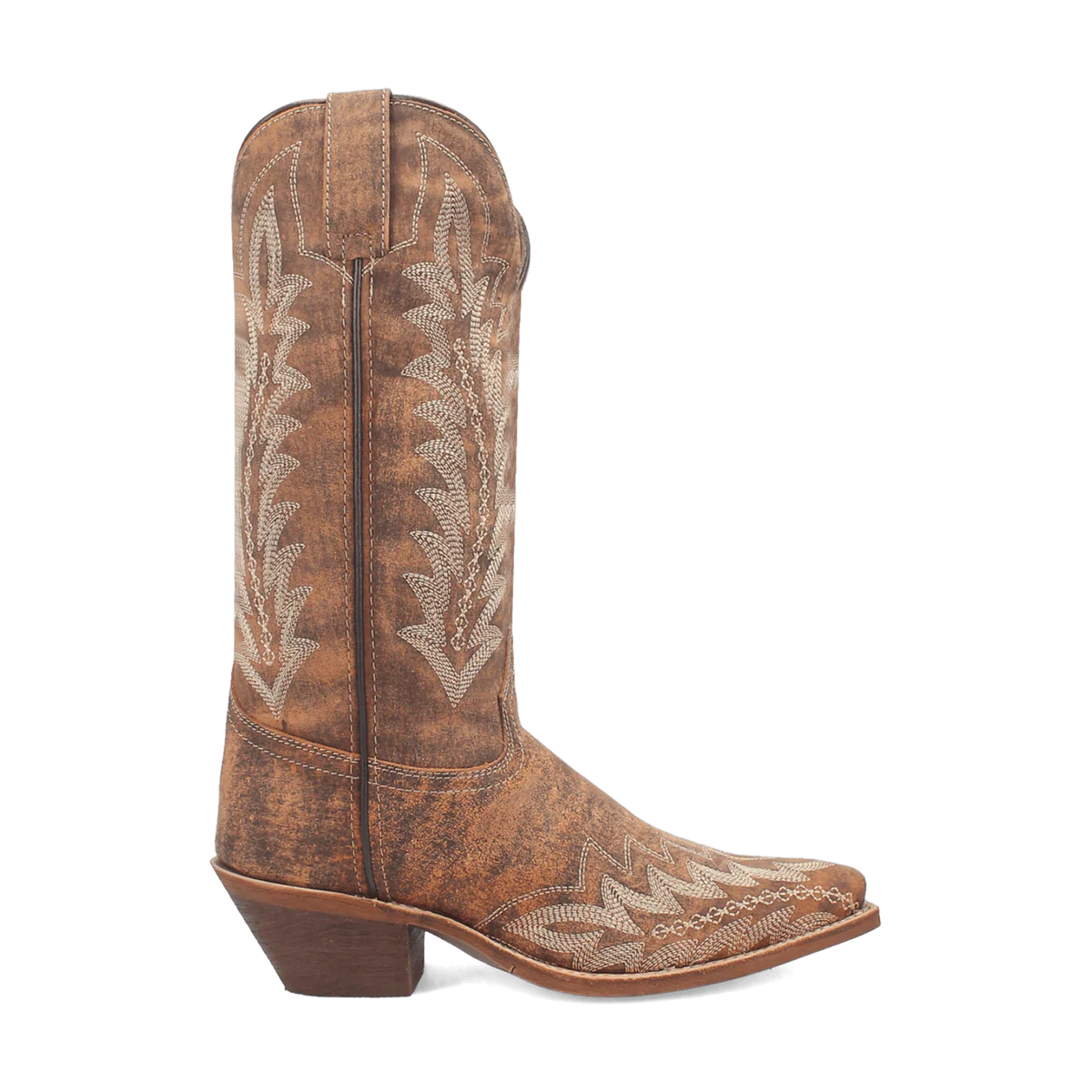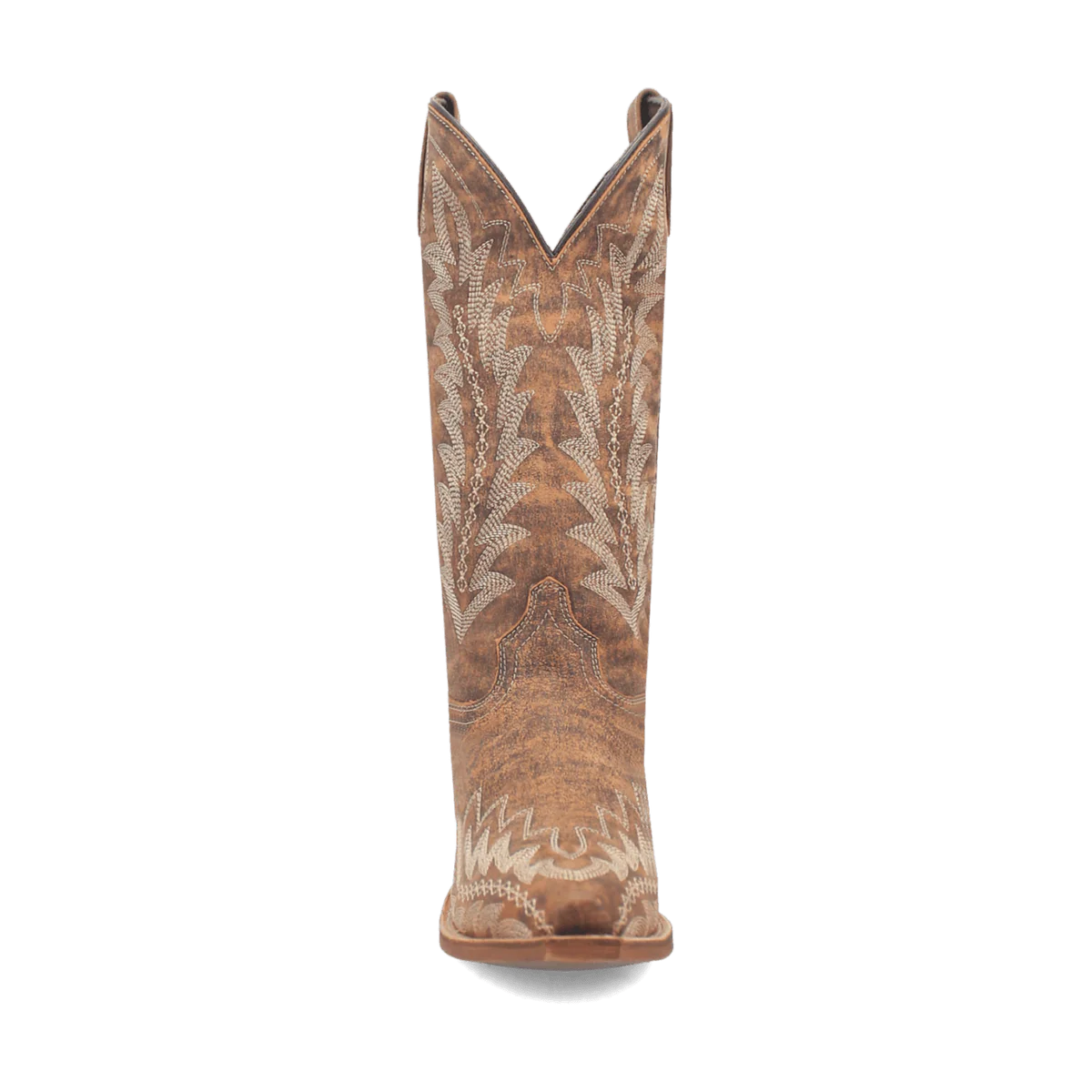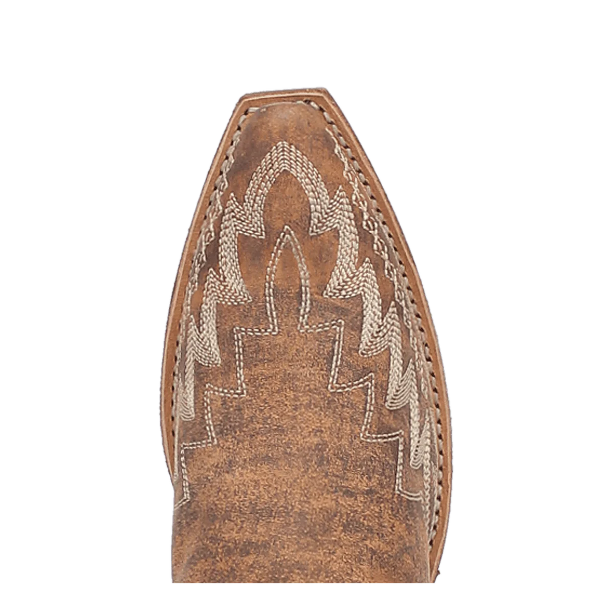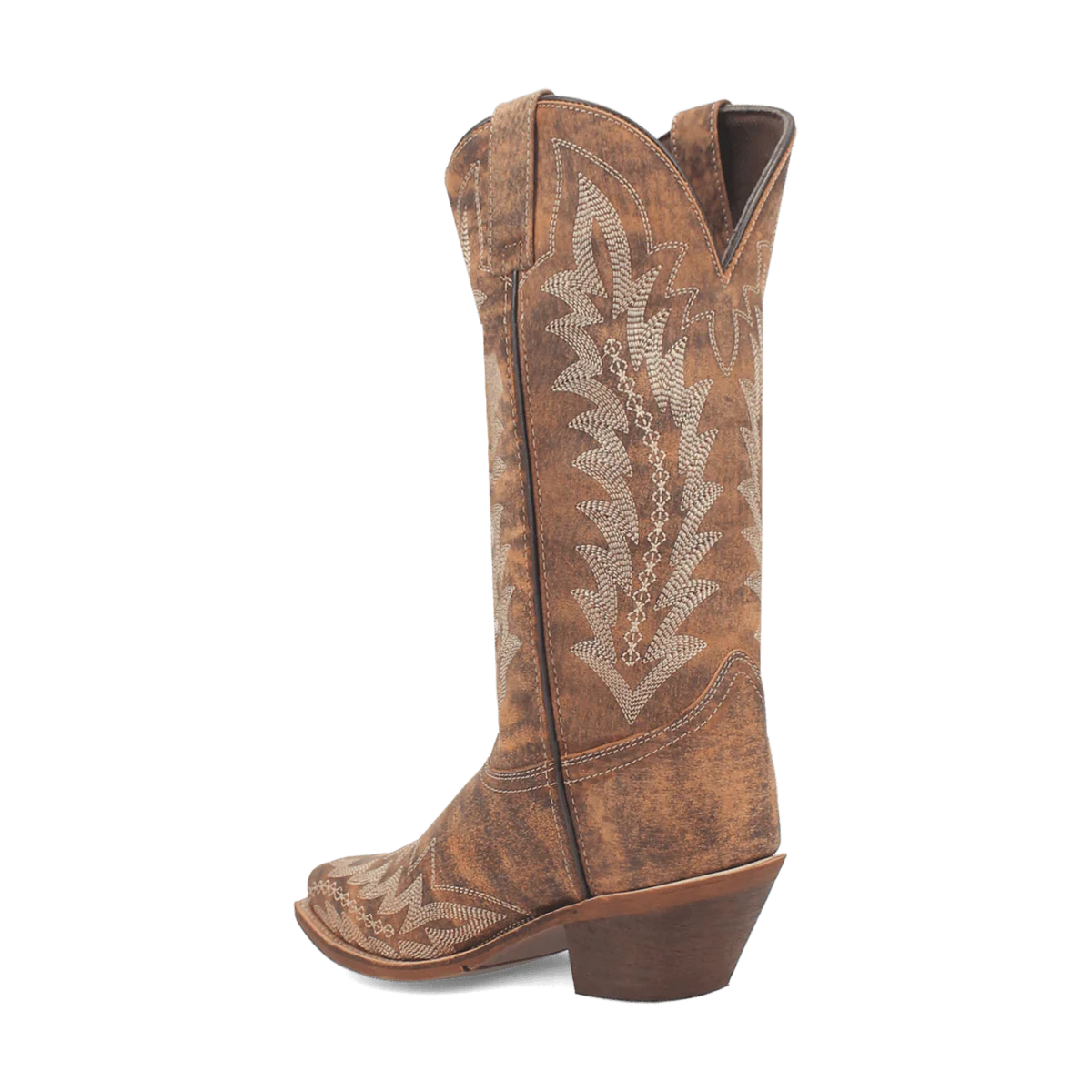 The Emmylee boot in tan effortlessly merges Western sophistication with rugged charm. Crafted with intricate Western stitching embellishing the top and foot, it showcases a snip toe, medium cowboy heel, and a cushioned comfort insole for added style and comfort.