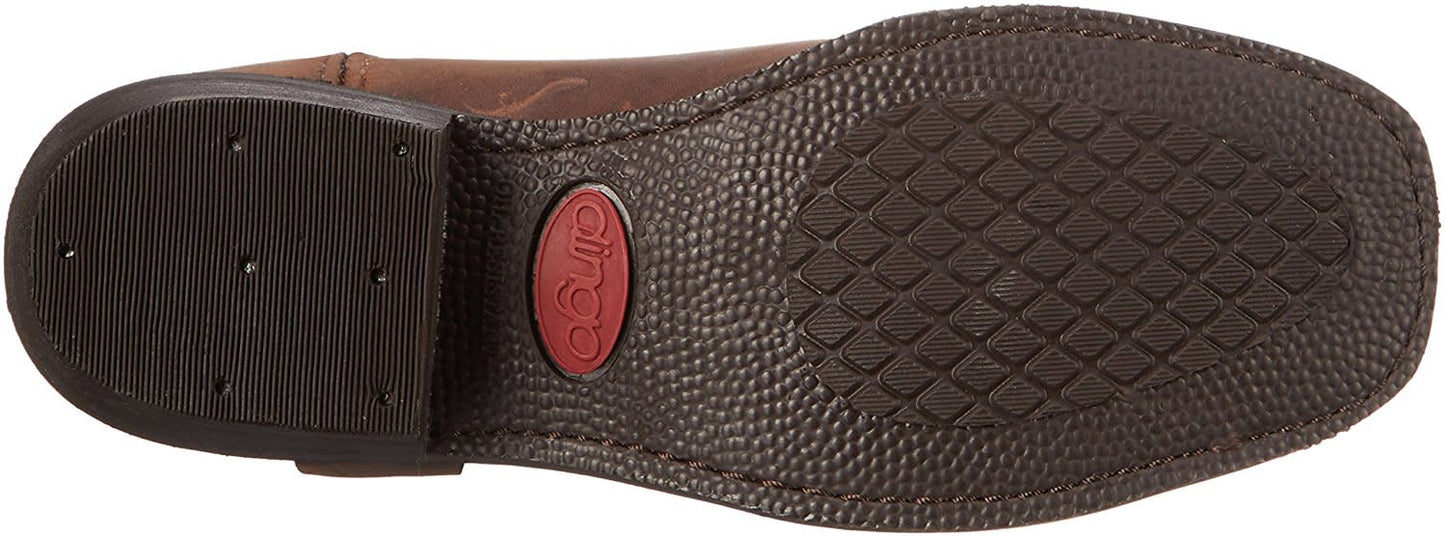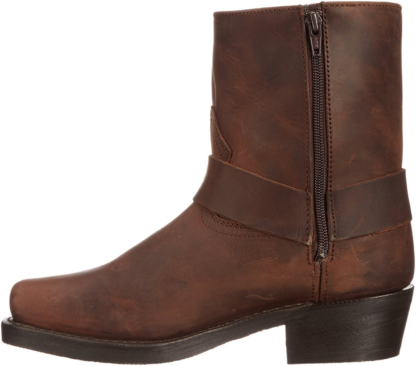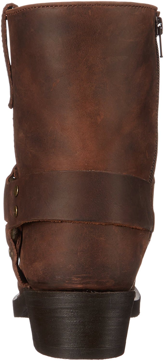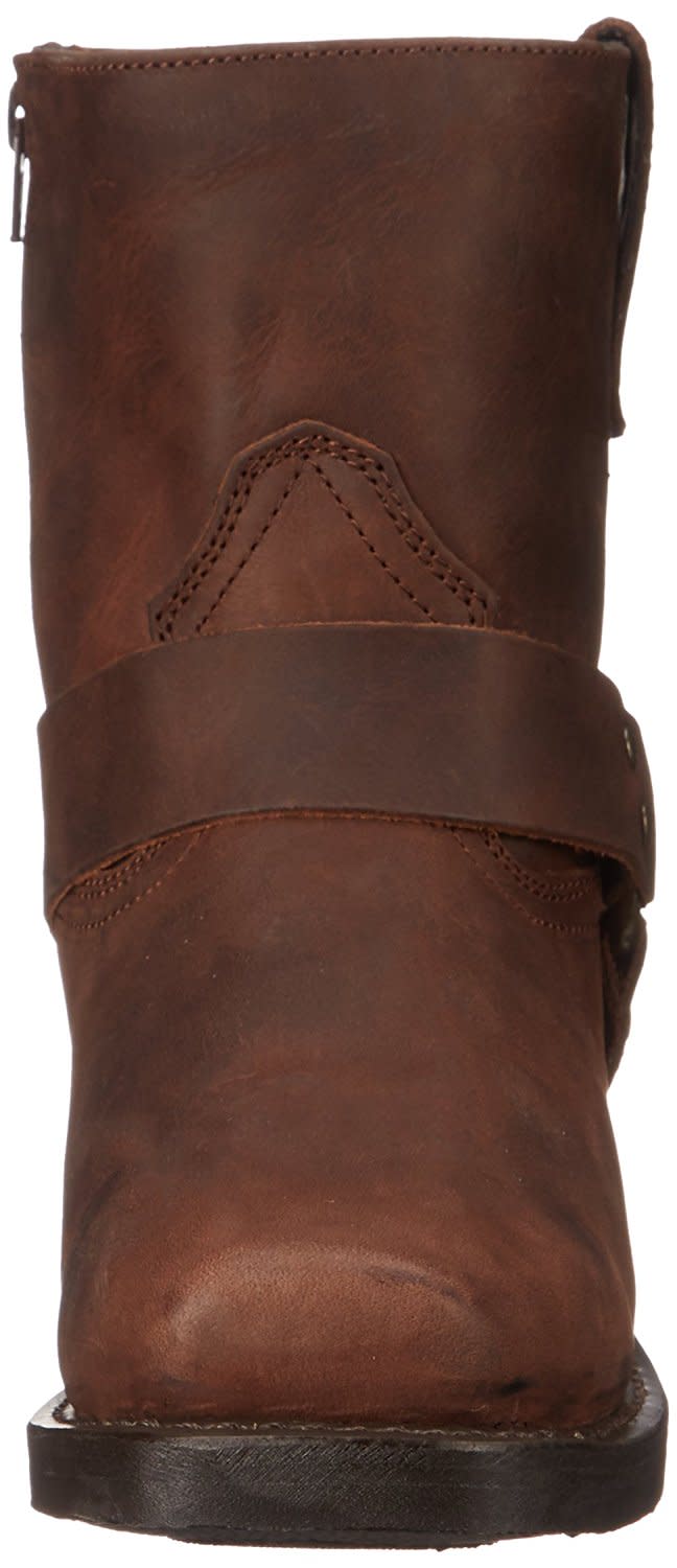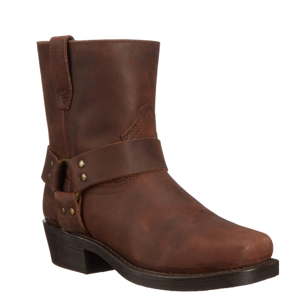 Hit the road in style with the Rev-Up moto boot. Constructed with a durable, full-grain leather with a smooth finish. The 7 shaft sits under a leather harness strap attached by a silver ring. Snoot toe, dogger heel, easy-on side zipper, and oil-resistant outsole.