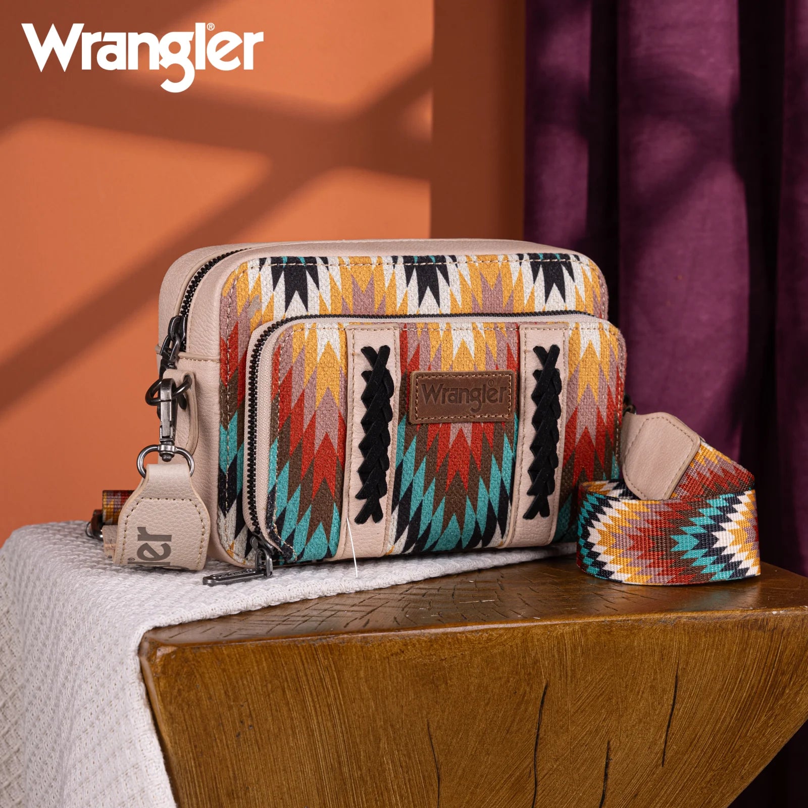 Wrangler Southwestern Pattern Dual Sided Print Crossbody Purse With Wallet Compartment - Tan - WG2211-3003TN